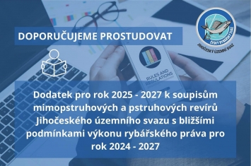 Byl vydán dodatek Rybářského řádu pro roky 2025–2027 k soupisům mimopstruhových a pstruhových revírů Jihočeského územního svazu, který obsahuje důležité změny a upřesnění podmínek výkonu rybářského práva.