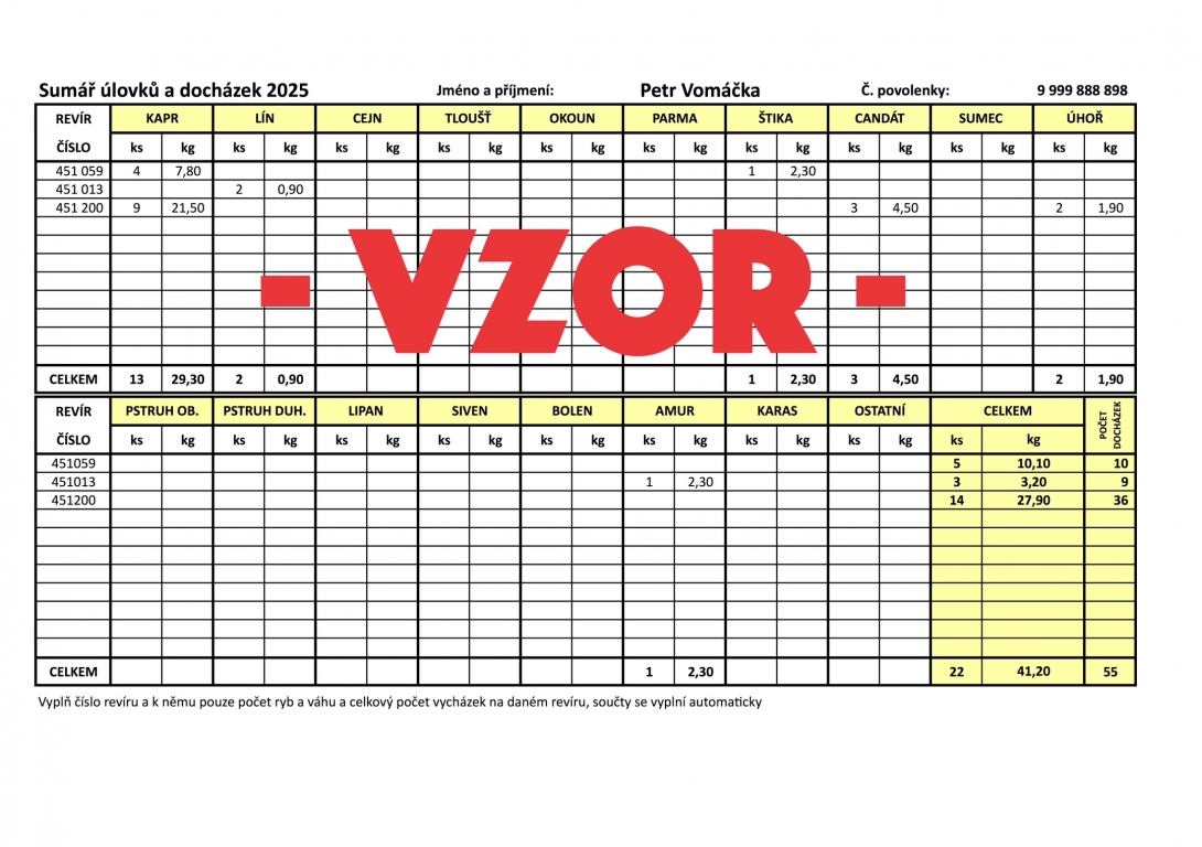 již minulou sezónu 2024 jsme začali vydávat povolenky prostřednictvím Rybářského informačního systému (RIS). V konečné fázi byl výdej bez větších problémů a o mnoho rychlejší. Co však ještě nefunguje, je sumarizace úlovků a docházek. Na toto není v současné povolence místo, ale přesto jsme povinni sumarizaci provést z důvodu krajské i celorepublikové statistiky. Rozhodli jsme se tedy zveřejnit "SUMÁŘ ÚLOVKŮ A DOCHÁZEK", jenž je přizpůsoben stránce A4 tak, aby si jej každý mohl vytisknout. Tento sumář nutně potřebujeme od každého z Vás při vrácení povolenky a proto prosíme o Vaši spolupráci.